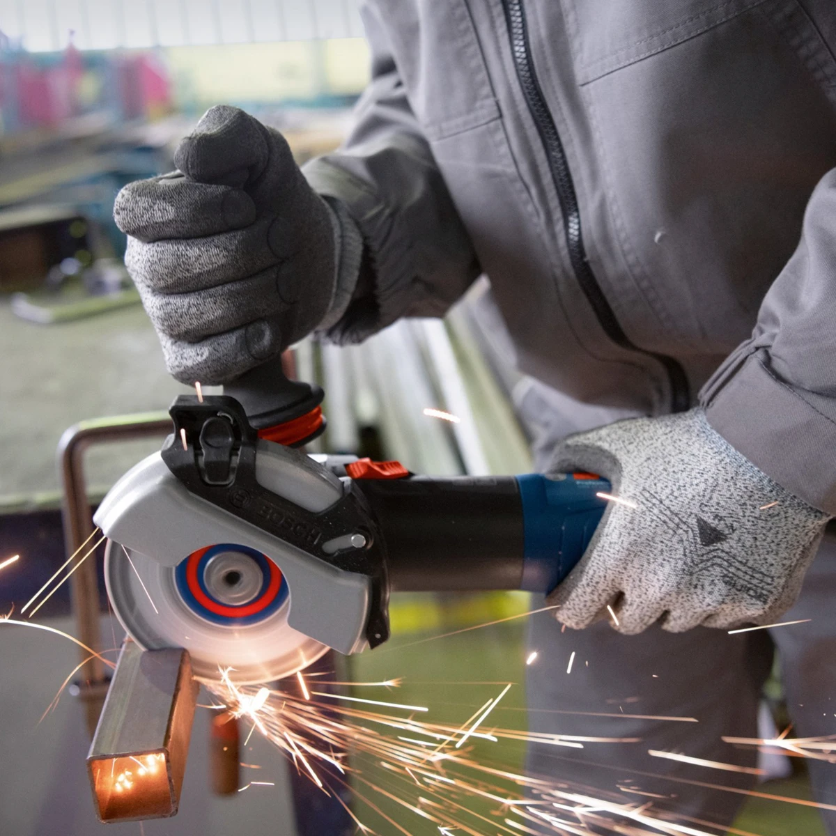 Amoladora Bosch de 2 000 W con disco de 230 mm y 6 500 rpm. Potencia y seguridad para cortes y desbastes profesionales.