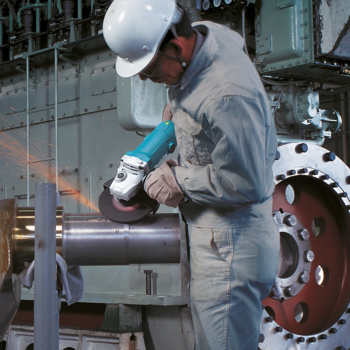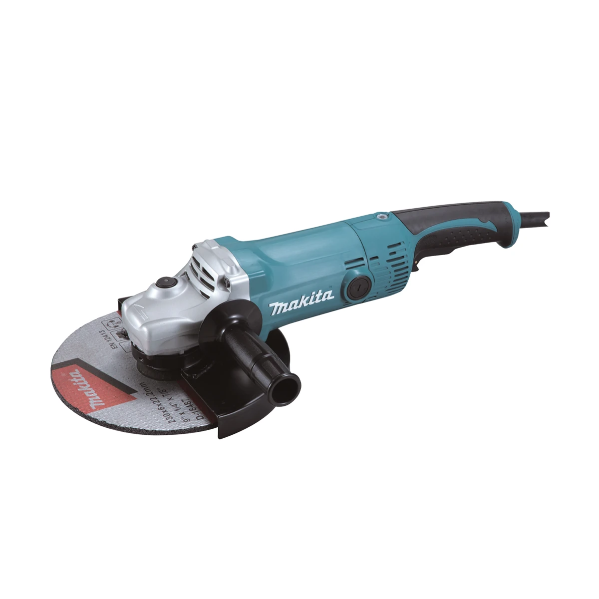 Amoladora Makita de 2 200 W con disco de 230 mm y 6 600 rpm. Equipamiento profesional con arranque suave y anti‑rearranque.