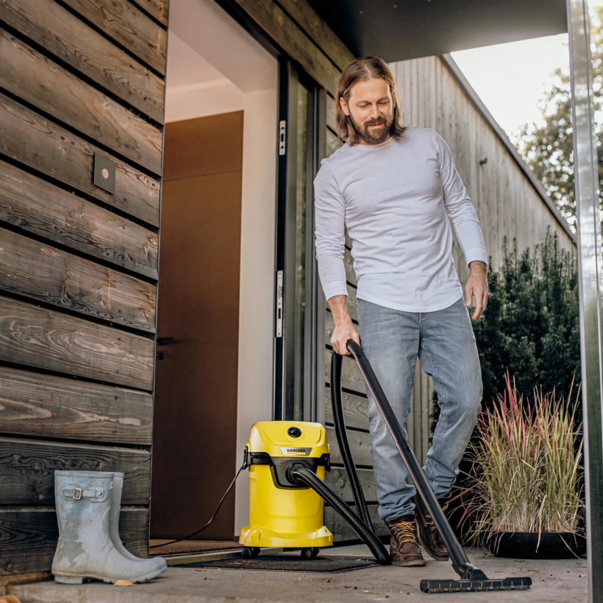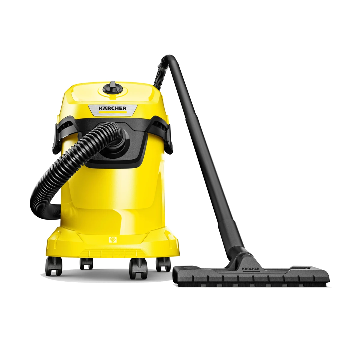 Aspirador Karcher WD 3 de 1 000 W con depósito de 17 L. Aspira líquidos y sólidos y cuenta con función de soplado.