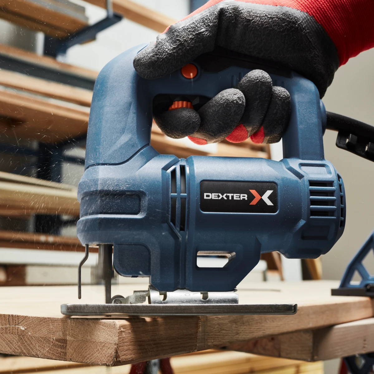 Sierra de calar de 500 W que permite realizar cortes rectos, curvos y biselados en madera y metal con gran precisión.