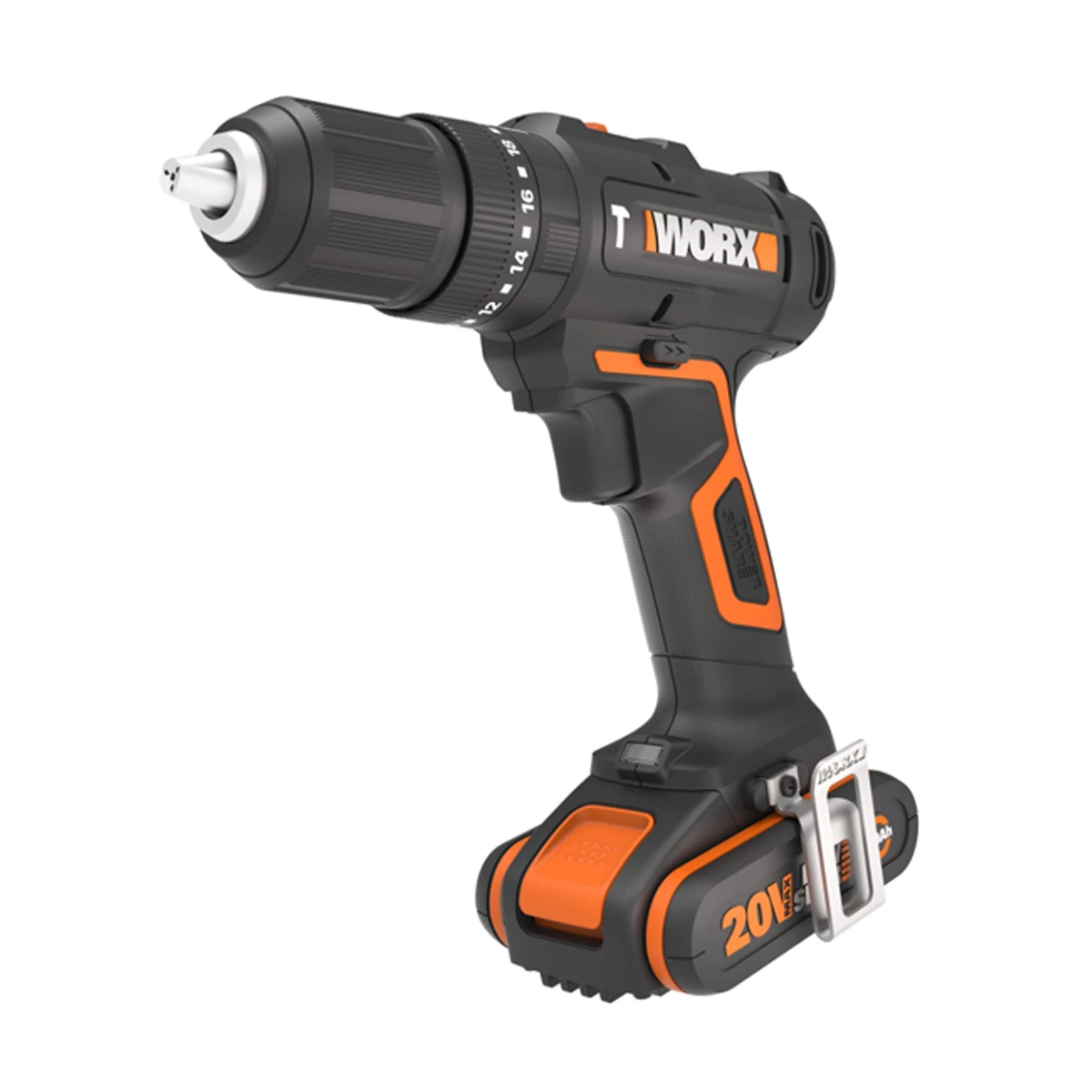 Taladro percutor a batería de 20 V con par de 60 Nm y 2 velocidades. Ideal para taladrar y atornillar sin cables en madera, metal y mampostería.